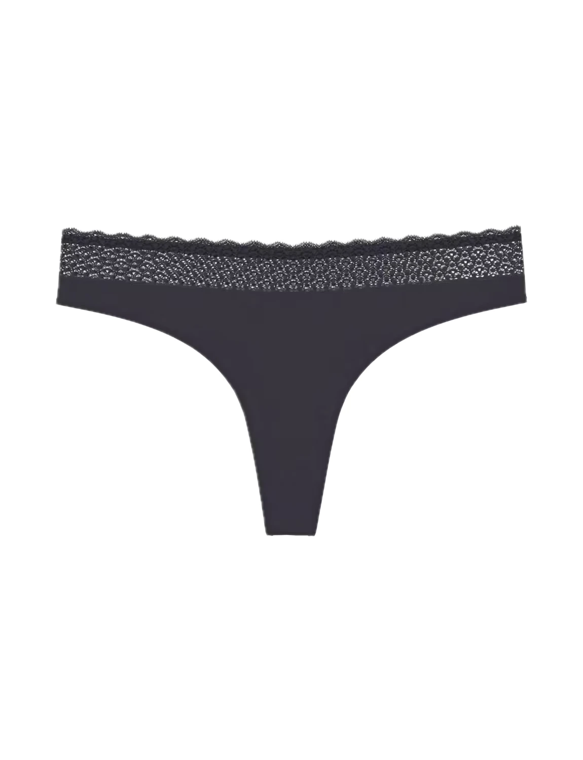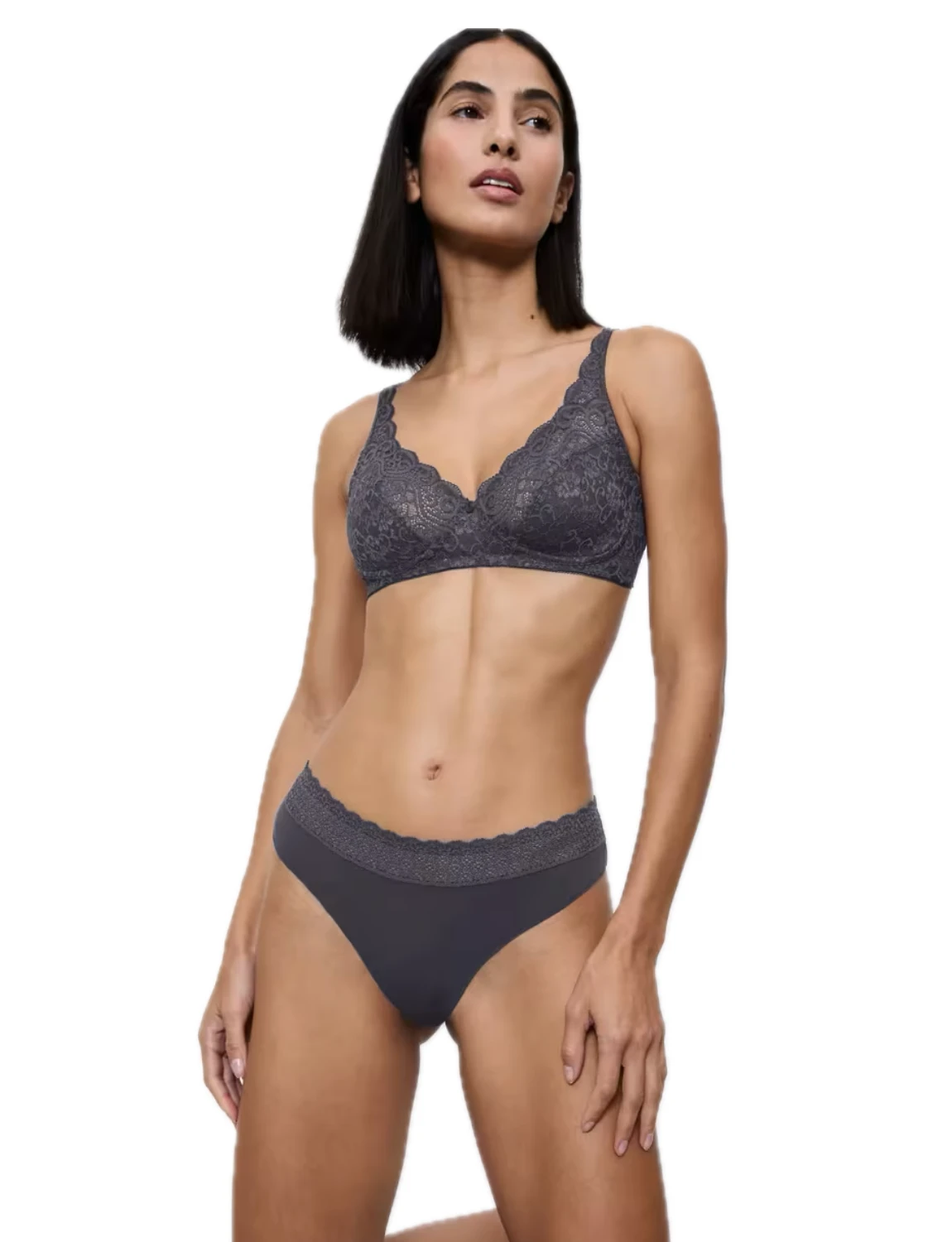 Γυναικείο εσώρουχο string με μαλακό λάστιχο στη μέση από ανακυκλωμένη δαντέλα. Μεταξένια υφή από ίνες modal και καβάλο από οργανικό βαμβάκι.