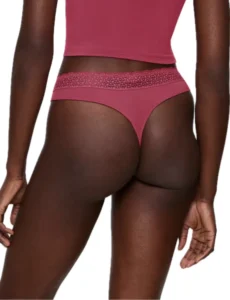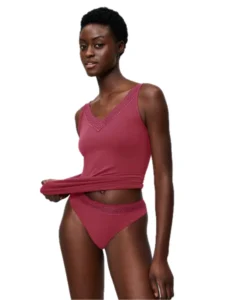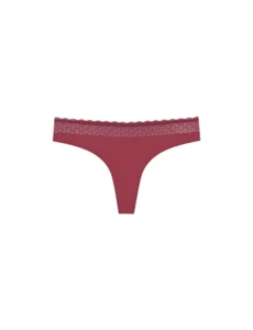 Γυναικείο εσώρουχο string με μαλακό λάστιχο στη μέση από ανακυκλωμένη δαντέλα. Μεταξένια υφή από ίνες modal και καβάλο από οργανικό βαμβάκι.