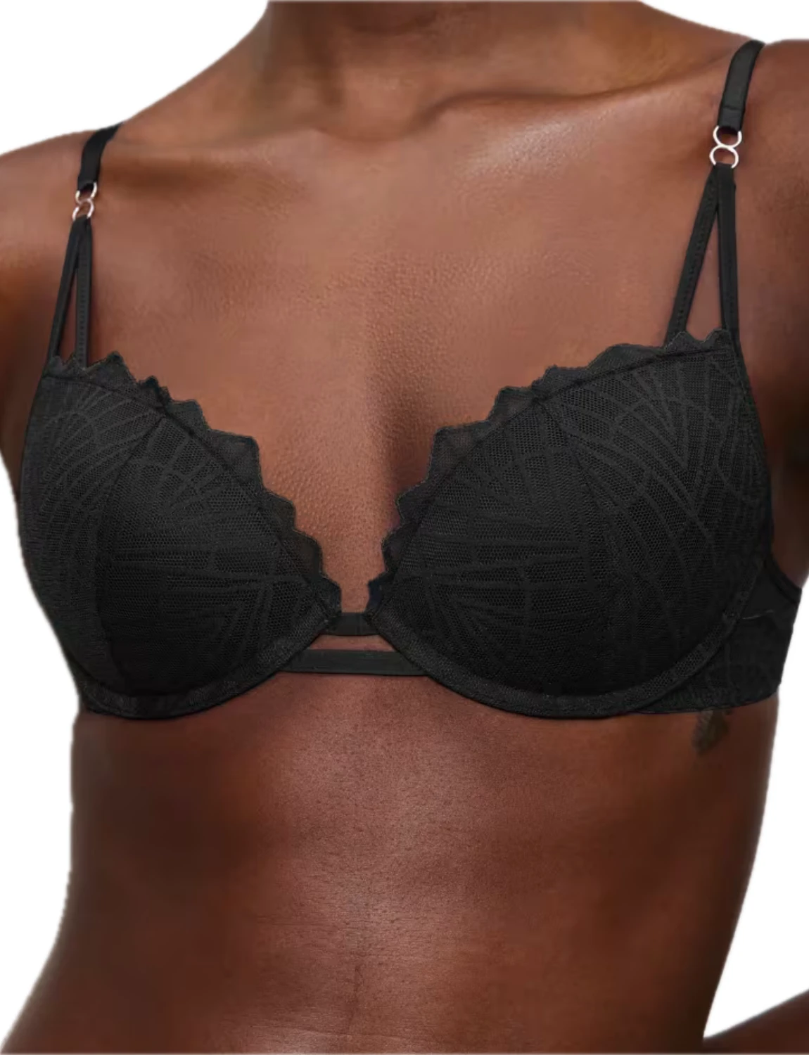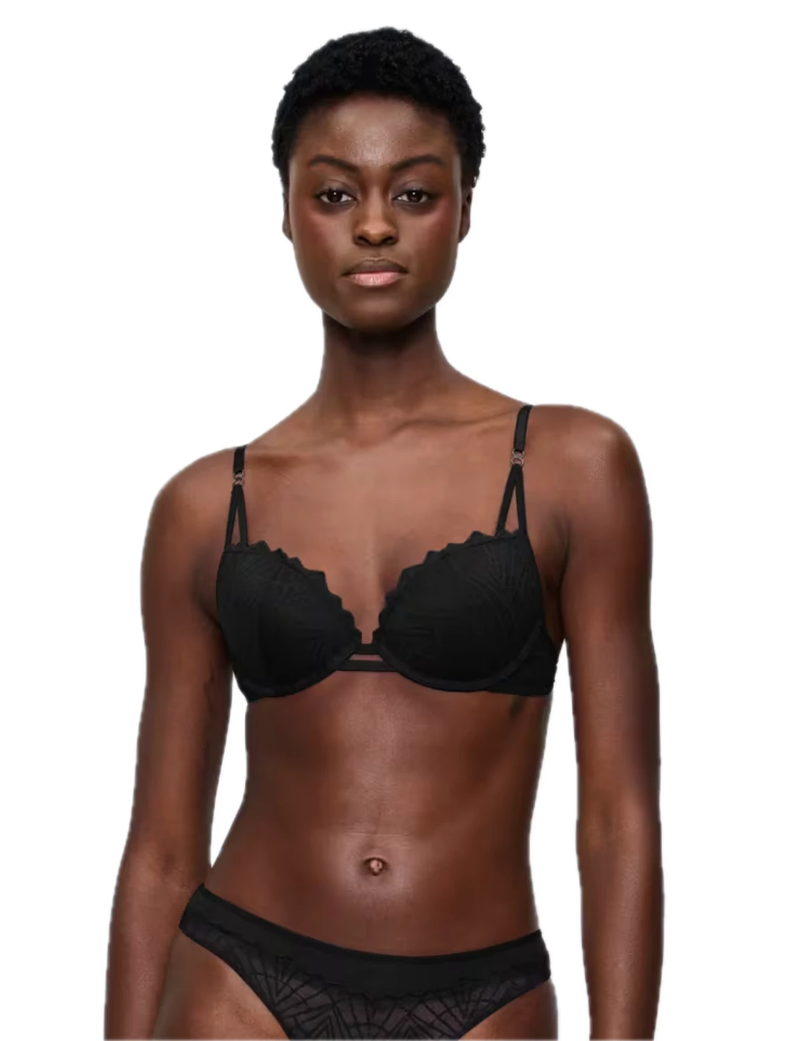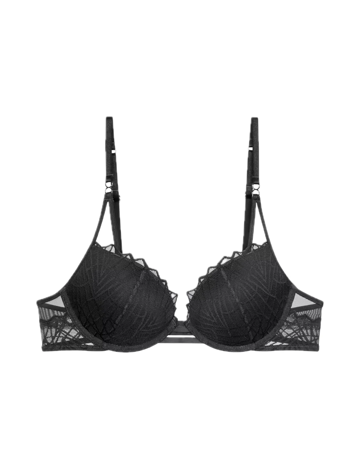 Αποκαλυπτικό push up σουτιέν με μπανέλα και μισή ενίσχυση, με βαθύ decollete. Ελαφρύ και εύκαμπτο comfort wire που προσφέρει άνετη εφαρμογή και χαρακτηριστική λεπτομέρεια με κρίκο και διπλές τιράντες χαρίζουν αισθησιακό χαρακτήρα. Η graphic δαντέλα συνδυάζεται με διχτυωτή διαφάνεια, δημιουργώντας ένα μοντέρνο και θηλυκό αποτέλεσμα.