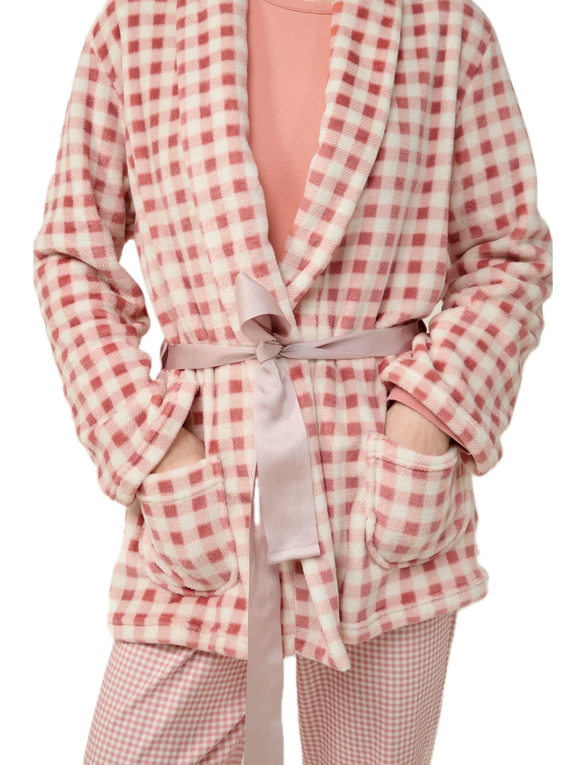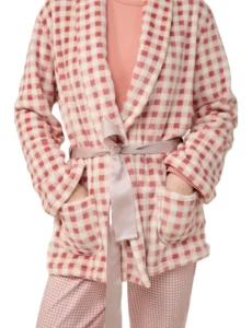 Αφεθείτε στην άνεση που χαρίζει αυτή η γυναικεία ρόμπα σε ροζ καρό μοτίβο. Σχεδιασμένη σε κλασική κρουαζέ γραμμή με απαλό πέτο, δένει μπροστά με κορδέλα για ρυθμιζόμενη εφαρμογή. Οι πλαϊνές τσέπες προσθέτουν πρακτικότητα, ιδανικές για να έχετε απαραίτητα αντικείμενα κοντά σας. Το απαλό fleece ύφασμα προσφέρει διαρκή απαλότητα και ζεστασιά που θα απολαύσετε χαλαρώνοντας στο σπίτι.