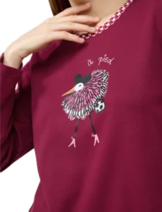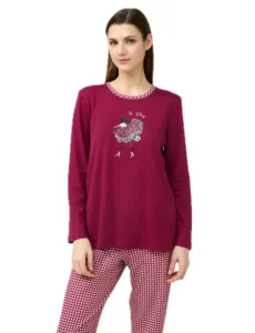Γυναικεία πιτζάμα vamp. Το σετ αποτελείται από μπλούζα με μακριά μανίκια και τύπωμα στο στήθος και παντελόνι με μοτίβο pied de poule. Ιδανικό για χαλάρωση στο σπίτι ή έναν απολαυστικό ύπνο, αυτό το σετ προσφέρει ζεστή, απαλή υφή και εξαιρετική διαπνοή στο σώμα.