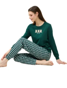 Γυναικεία πιτζάμα vamp. Το σετ αποτελείται από μακριμάνικη μπλούζα με μανσέτες στα μανίκια, τύπωμα στο στήθος και στρόγγυλη λαιμόκοψη και παντελόνι καρό με μανσέτες στο τελείωμα. Ιδανικό για χαλάρωση στο σπίτι ή έναν απολαυστικό ύπνο.