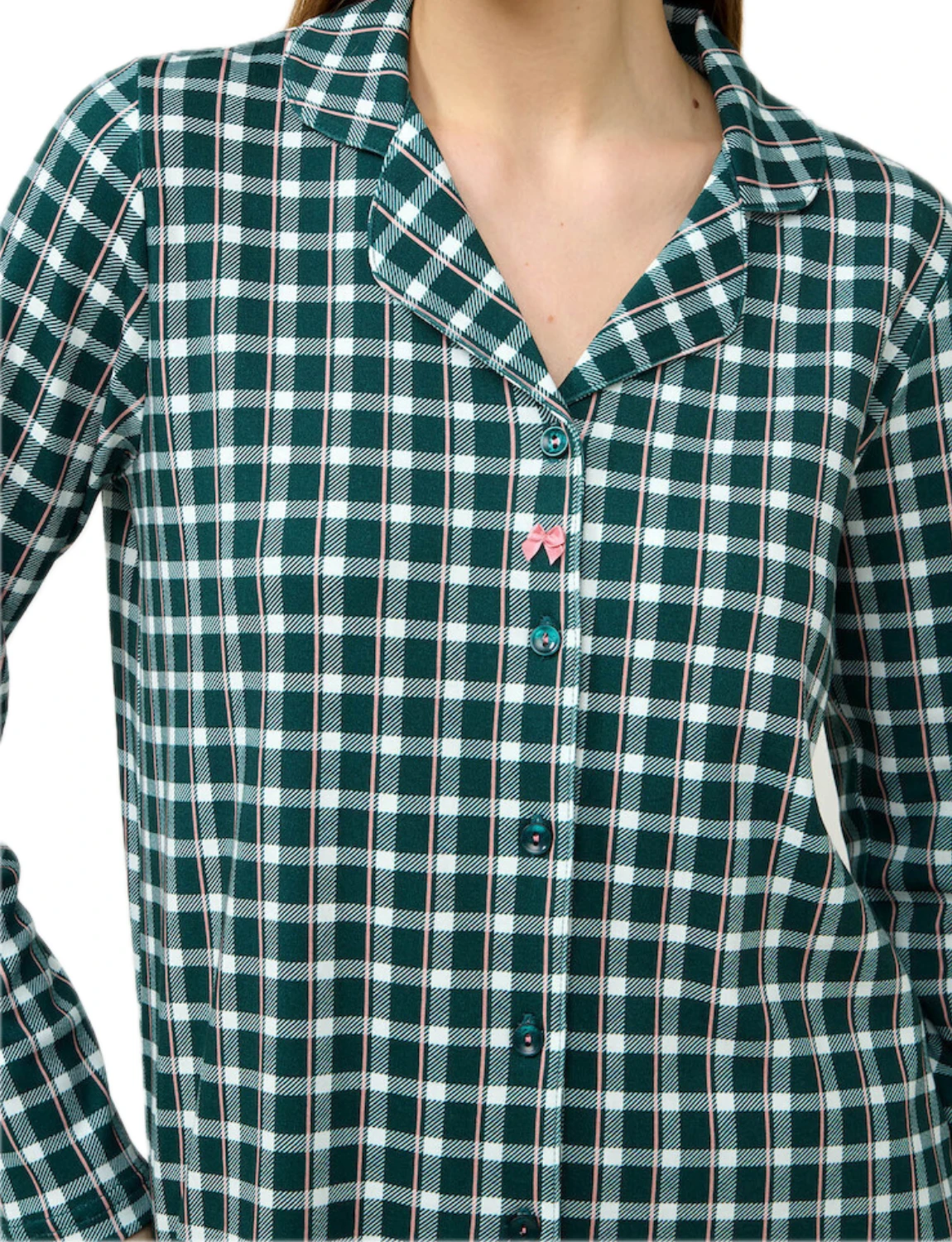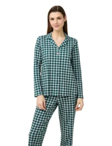 Αφεθείτε στην άνεση και το στυλ που χαρίζει αυτό το σετ γυναικείες πιτζάμες, κατασκευασμένο από 100% απαλό βαμβάκι interlock. Σχεδιασμένο με κλασικό κουμπωτό πάνω μέρος σε πράσινο καρό μοτίβο με λεπτές ροζ γραμμές, συνδυάζει διαχρονική γοητεία και καθημερινή άνεση. Ιδανικό για να απολαύσετε τις στιγμές χαλάρωσης σας ή το βραδινό σας ύπνο.