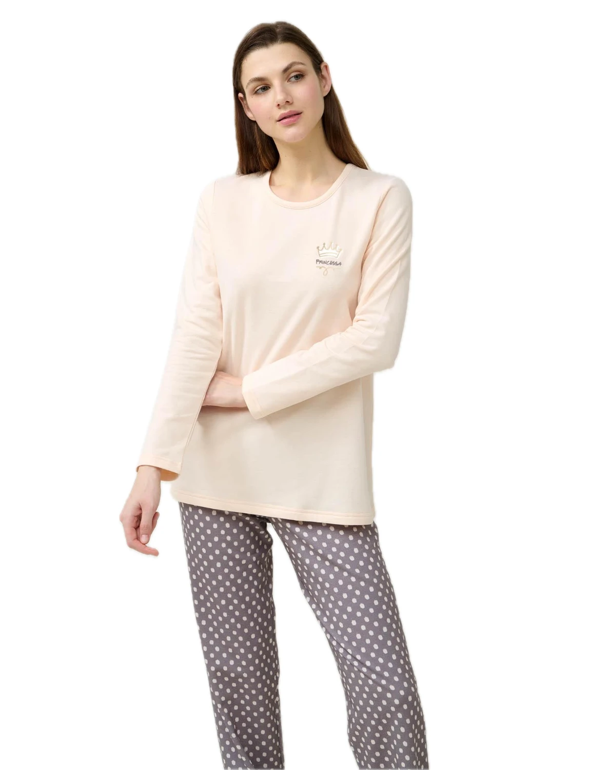 Απολαύστε ζεστά και άνετα βράδια με αυτό το χειμερινό σετ γυναικείες πιτζάμες.Το σετ αποτελείται από μονόχρωμη μακριμάνικη μπλούζα με στρόγγυλη λαιμόκοψη και τύπωμα και παντελόνι πουά. Ένα σετ ιδανικό για στιγμές χαλάρωσης στο σπίτι ή έναν ήρεμο, ξεκούραστο ύπνο.