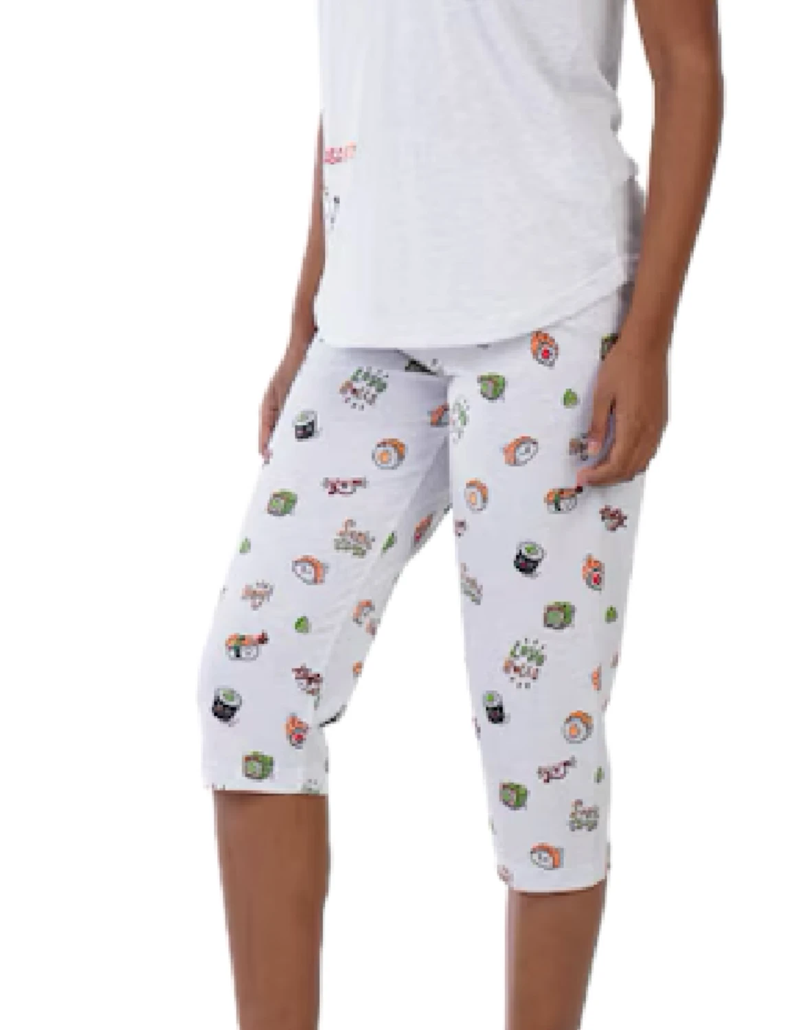 Γυναικείο σετ πιτζάμες. Το σετ αποτελείται από κοντομάνικη μπλούζα με στρογγυλή λαιμόκοψη και παντελόνι με μήκος μέχρι το γόνατο.