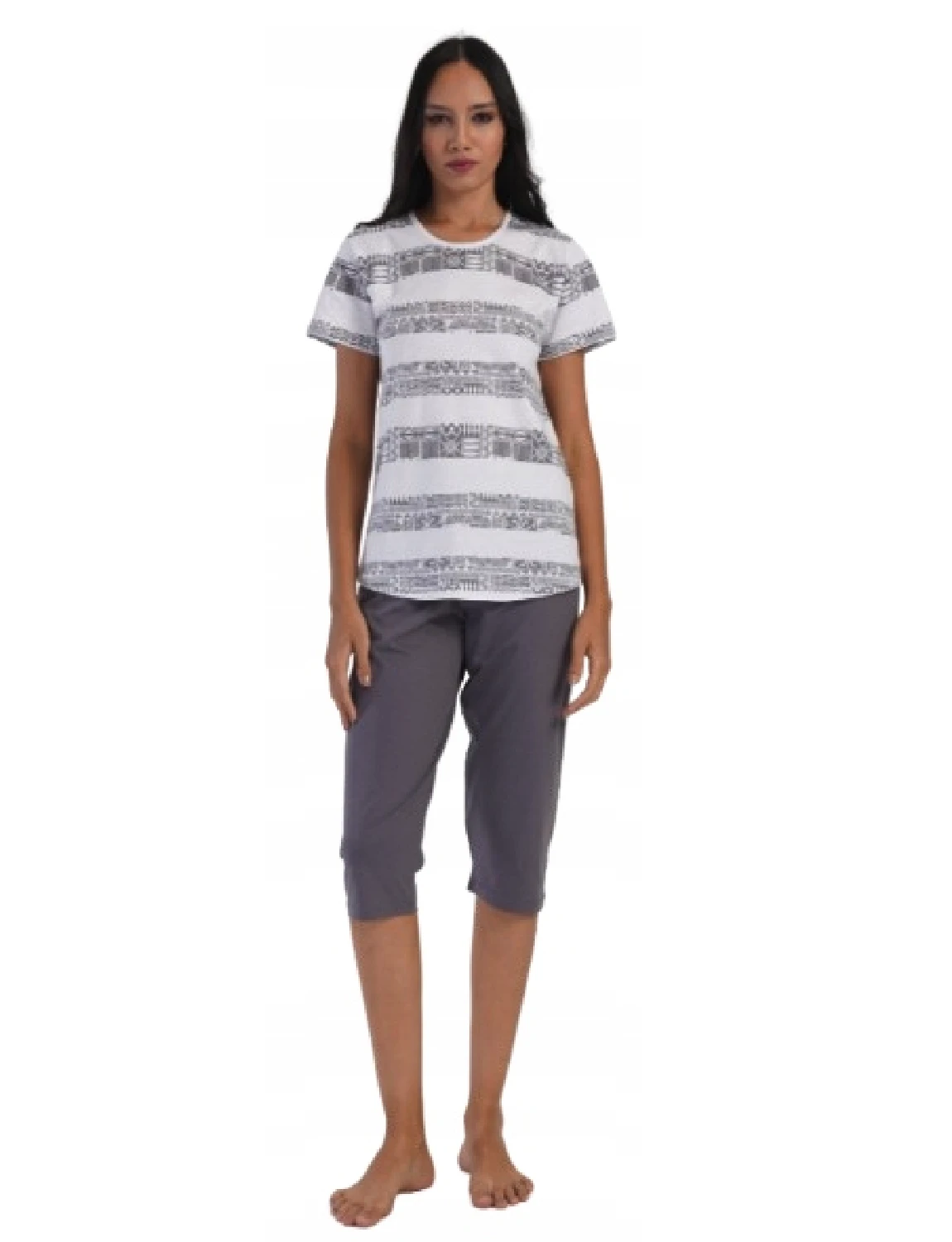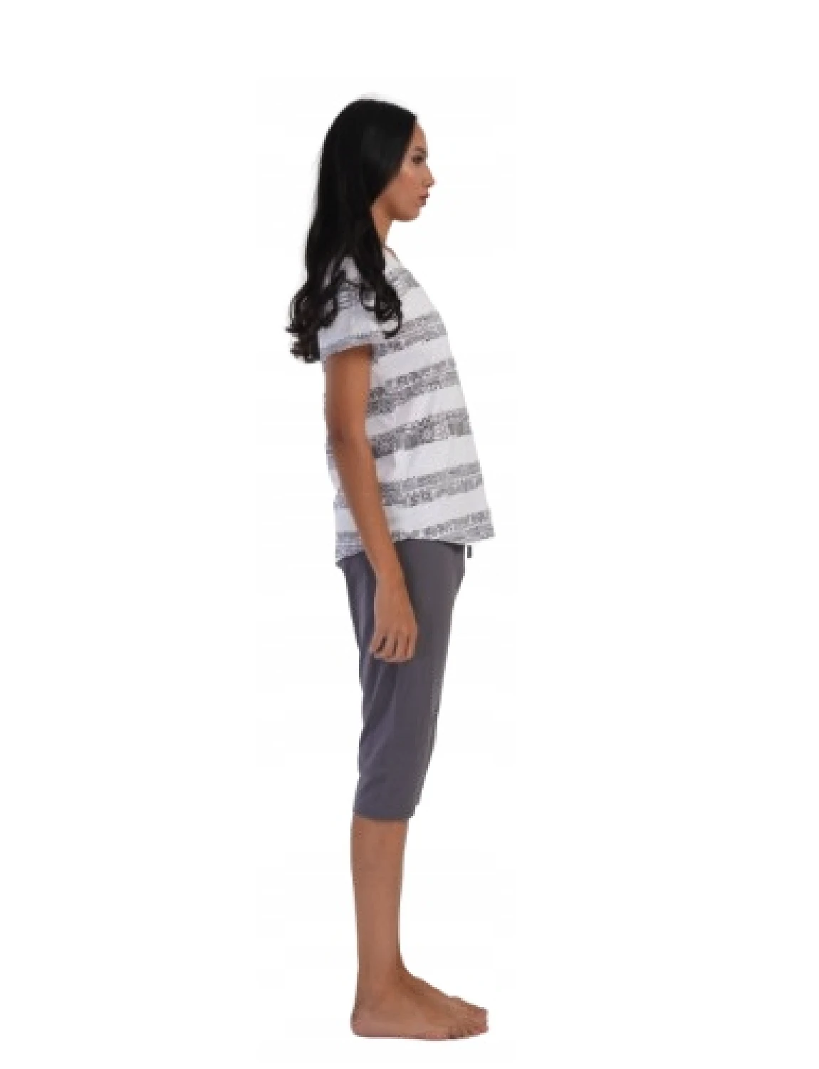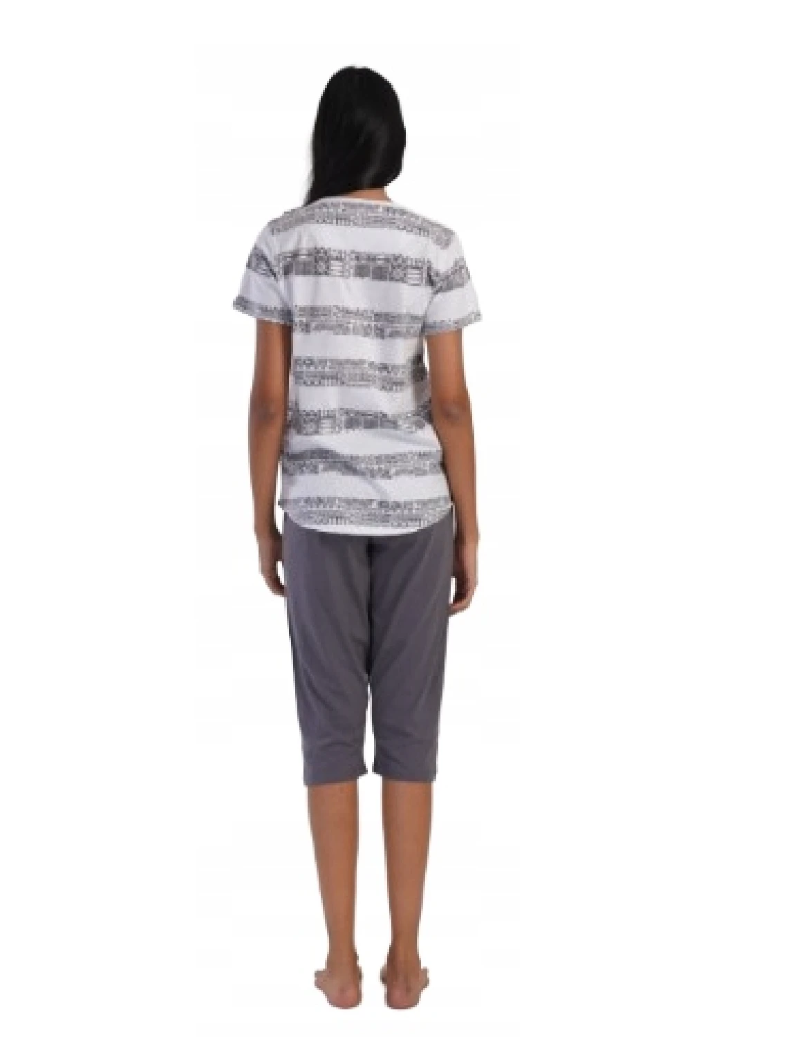 Γυναικείο σετ πιτζάμες. Το σετ αποτελείται από κοντομάνικη μπλούζα με στρογγυλή λαιμόκοψη και παντελόνι με μήκος μέχρι το γόνατο.