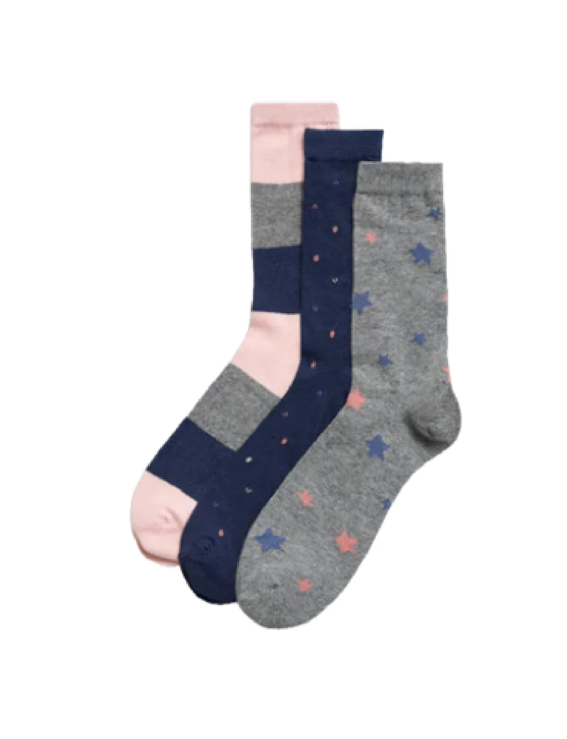 Συσκευασία 3 γυναικείων καλτσών με σχέδιο και τεχνολογία αντιπίεσης για άνετη και απαλή εφαρμογή.