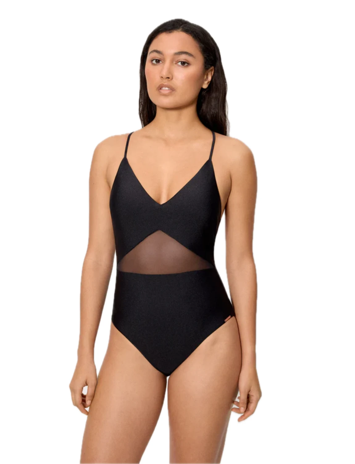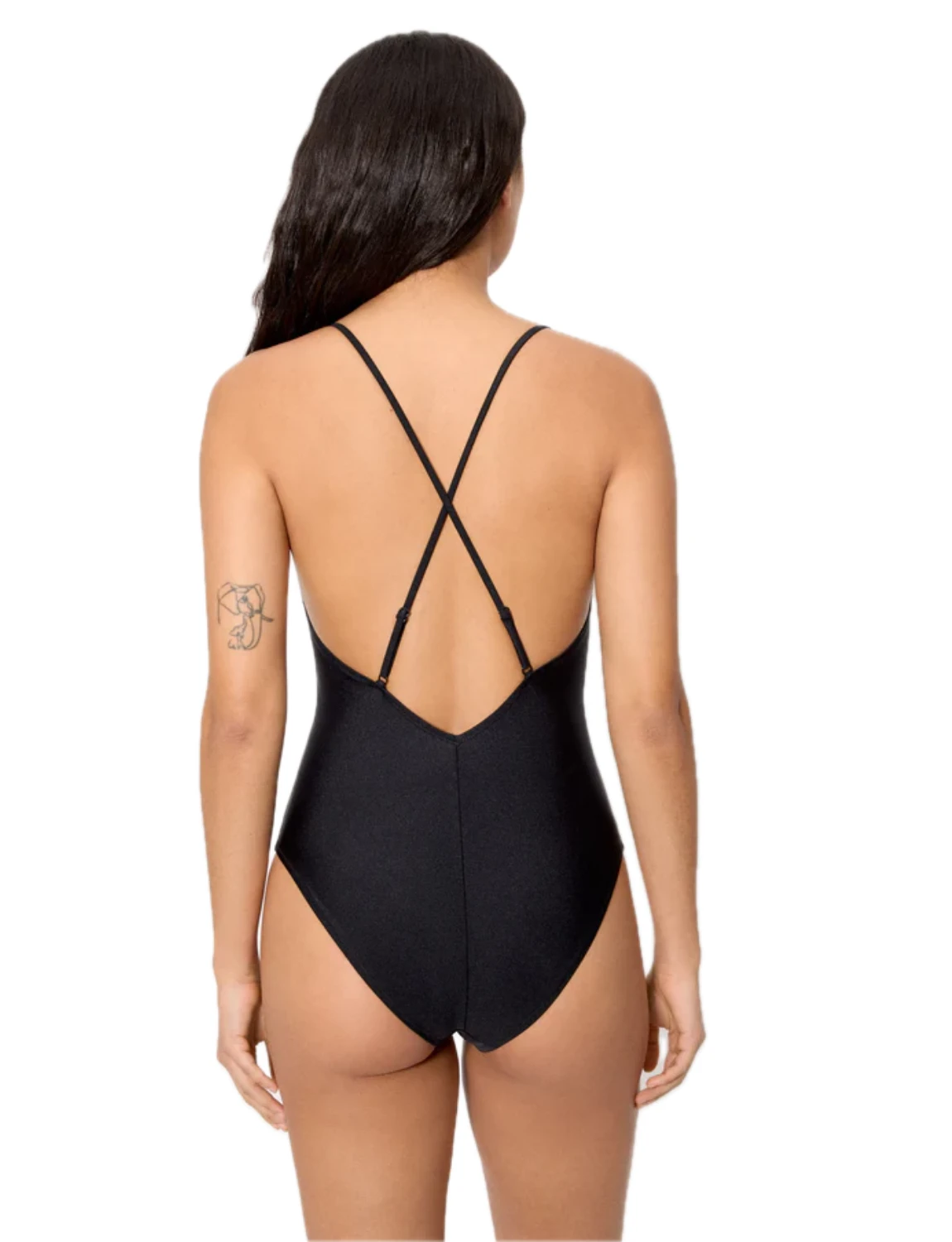 Γυναικέιο ολόσωμο μαγιό χωρίς μπανέλα, με αφαιρούμενη επένδυση και ρυθμιζόμενες χιαστί τιράντες. Ύφασμα με γυαλιστερό φινίρισμα. Ιδανικό για μια άνετη καλοκαιρινή εμφάνιση.